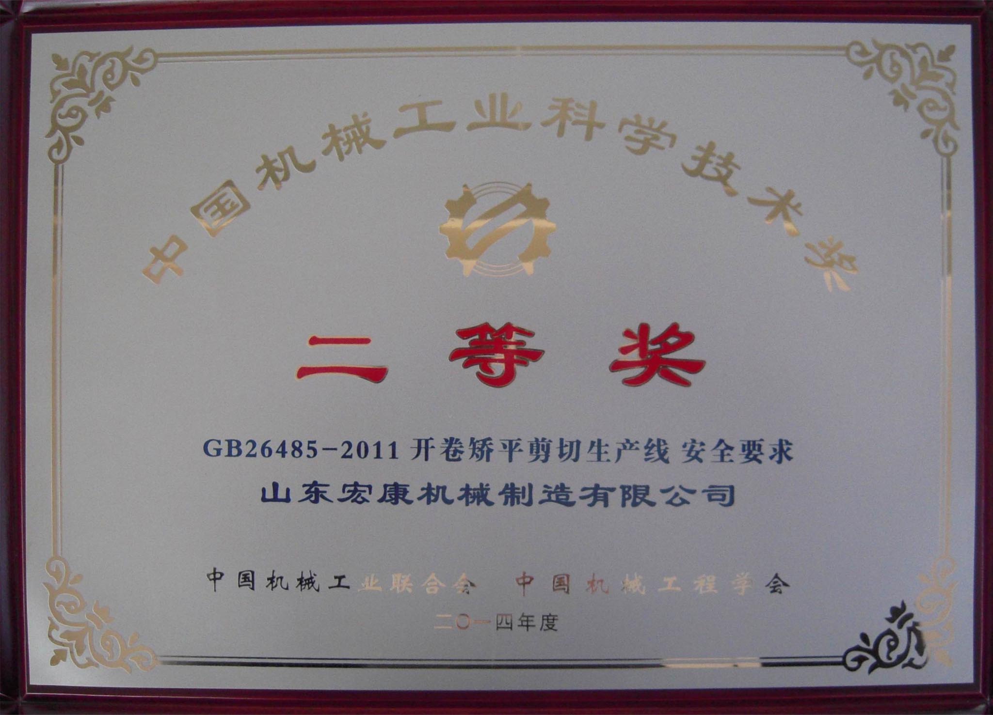 根據中國機械工業科學技(jì)術獎勵工作辦公室《關於表彰2014年度中國機械工業科學(xué)技術獎獎勵項目的通報》,集團公司主持製定的《GB26485-2011 開卷矯平剪切生產線 安全要(yào)求》國家標準獲中國機械(xiè)工業科學(xué)技術進步二等獎。
