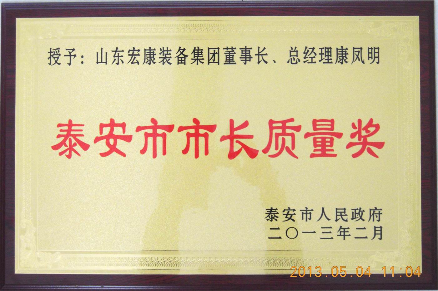 近日,泰安市人民政府下發《關於表(biǎo)彰獎勵2012年度(dù)泰安市市長質量獎獲獎單(dān)位和個人的通報》(泰政函【2013】15號)文件,集團(tuán)董事(shì)長、總經理康(kāng)鳳明被授予2012年度“泰安市市長質量獎(jiǎng)”,並(bìng)受到獎勵。
