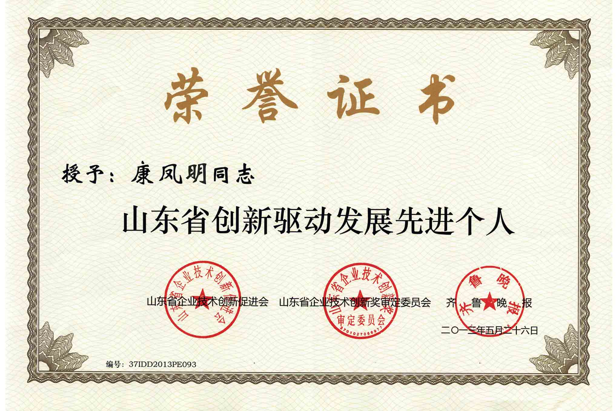 日前,據山東省企業技(jì)術創新(xīn)促進會魯創促字【2013】9號文件(jiàn)《關於表彰全省企業技術創新能力建設工作百強企業和先進單位個人的通報》,我集團公司被評為“山東省創新驅動發展(zhǎn)先進單位”,董事長、總經理康鳳明被授予“山(shān)東(dōng)省創新(xīn)驅動發展先進個人(rén)”。
