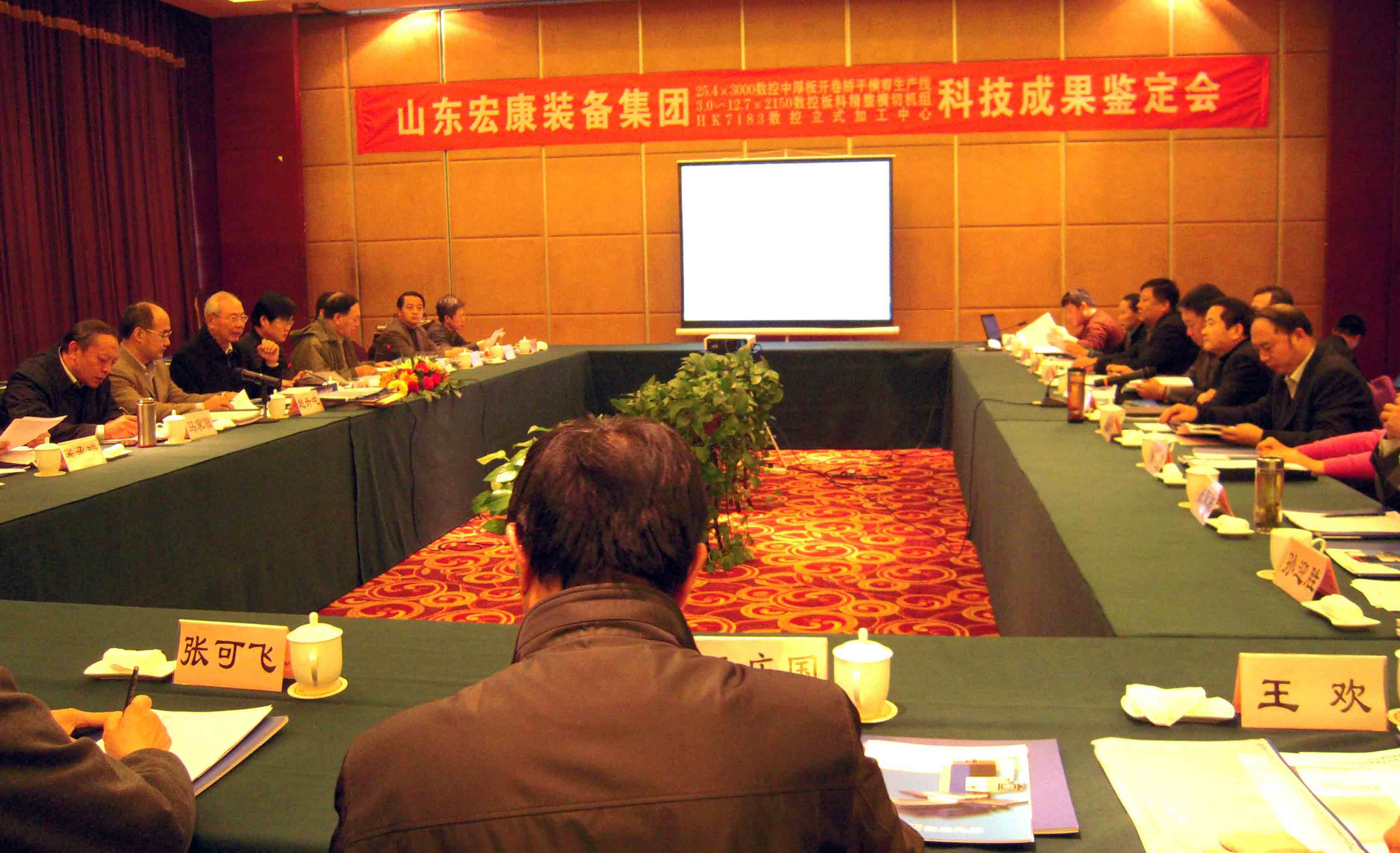 2012年(nián) 11月25日,集團科技成果鑒定會在(zài)泰安召開。山東(dōng)省科(kē)技廳、山東省經濟和信息化委員會組(zǔ)織專家對我集(jí)團完成的三項科技成果進行了會議鑒定。鑒定委員會專家考(kǎo)察了研製現場(chǎng)、聽取(qǔ)了課題組匯報、觀看了(le)設備運行錄像、審查了相關資料,經質詢、討論, 最後得出鑒定意見:“3.0~12.7×2150數(shù)控板料精整橫切機組”、“25.4×3000數控中厚板開卷矯平橫剪生產線”達到國際先進水平,“HK7183數控立式加工中心”達到(dào)國內領先水平。
