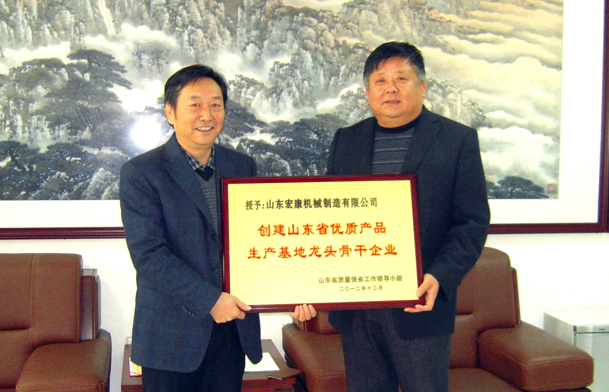 近日,山東省(shěng)質量興(xìng)省領導小組下發魯質強發【2012】2號文件《關於表彰2012年創建山東省優質產品生產基地及龍(lóng)頭骨幹企業的通知(zhī)》,www.草莓视频.com榜上有名,喜獲2012年“創建山東省優質產品生產基地龍頭骨幹企業”榮譽稱(chēng)號。圖為1月30日岱嶽區質監局局長張(zhāng)複田向集團董事長、總經理(lǐ)康鳳明(míng)頒發榮譽牌(pái)匾。