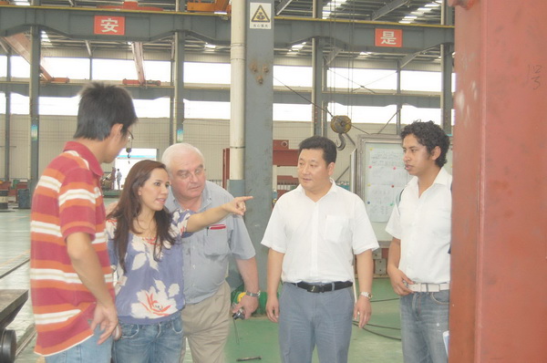 8月6日,墨西哥Commecimex公司首席執行官艾斯特·美地娜(左二)及隨從(cóng)一行三人在我公司副總經理朱洪軍陪同下來公(gōng)司(sī)實地考察鋼材加工設備。