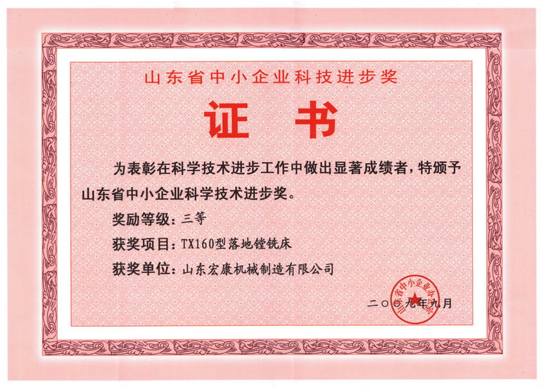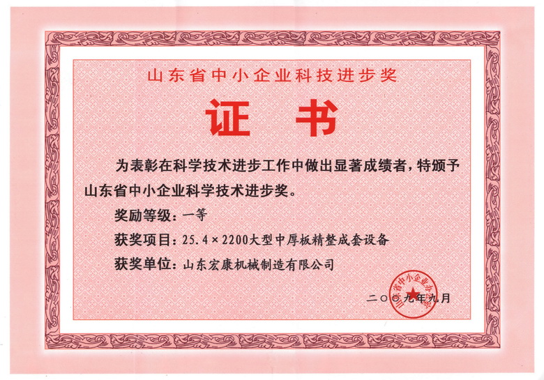 公司三項(xiàng)科技成果榮獲2009年山東省中(zhōng)小企業科技進步獎(jiǎng),其中(zhōng)“25.4×2200大型中厚板精整成套設(shè)備”和“T44-0.3~4×1650數控開卷矯平剪切生產線”兩個項目獲一等獎(jiǎng);“TX160型落地(dì)鏜銑床”項目獲三等獎。