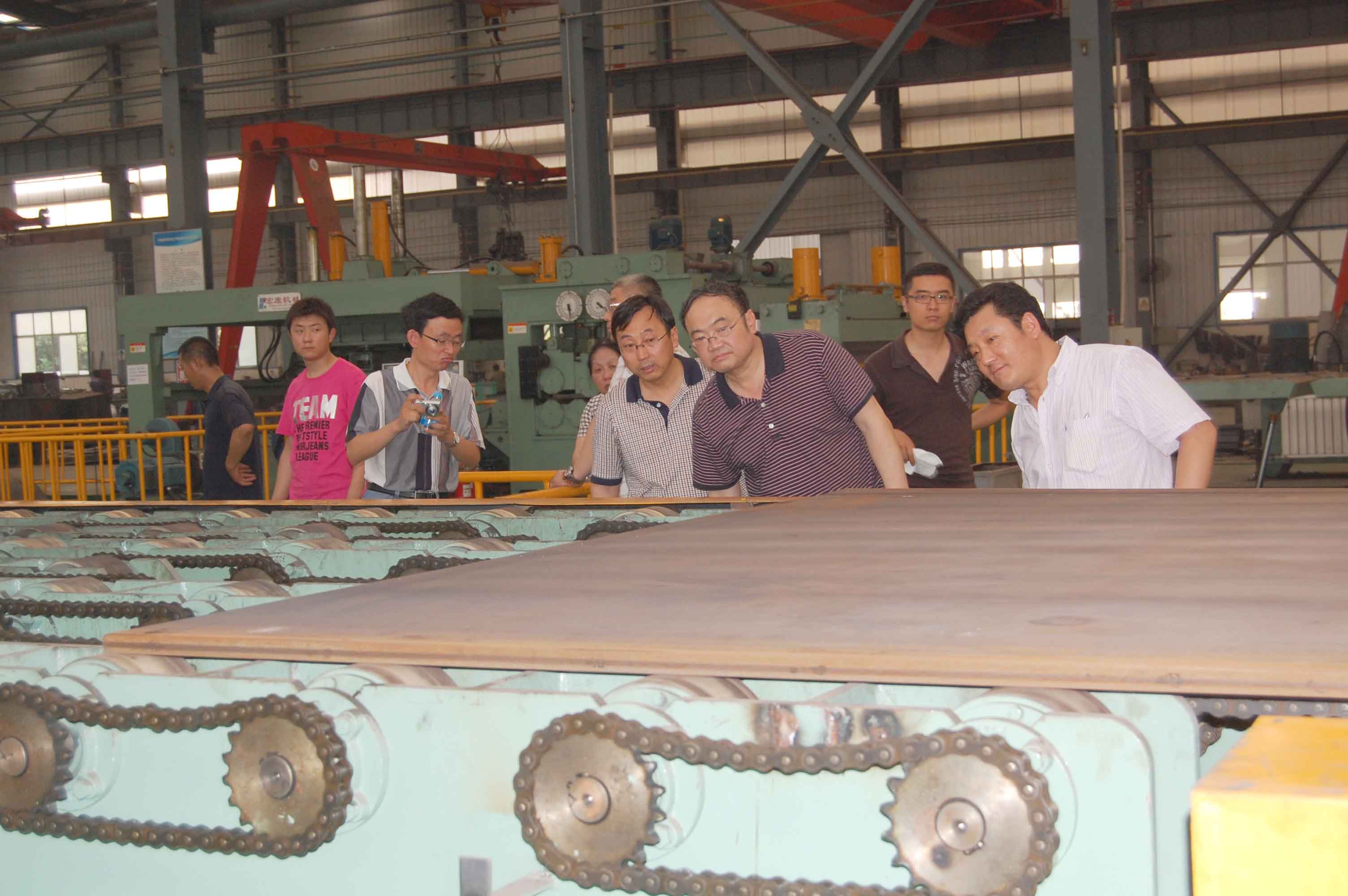 6月29日,首(shǒu)鋼京唐鋼鐵聯合公司領導組(zǔ)團來公司考察(chá)。圖為副(fù)總經理朱洪軍(jun1)陪同該公司銷售部常務副部長劉憲君在鋼鐵物流公司考察T44-5~25.4×2200開卷(juàn)矯平移動剪切(qiē)生產線。